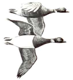 These are sea geese, the blacks wintering south to Baja, California, in the Pacific. The Atlantic race winters from Virginia northward. Flight is swift, in irregular and changing flock patterns.
