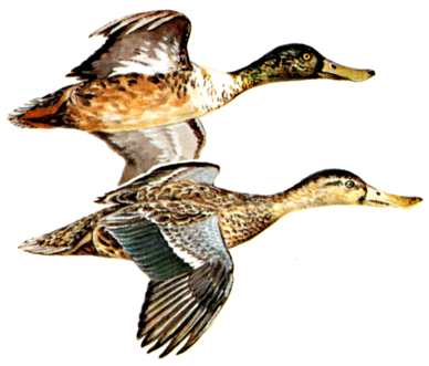 The mallard is our most common duck, found in all flyways. The males are often called "greenheads." The main wintering area is the lower Mississippi basin, and along the gulf coast, but many stay as far north as open waters permits.