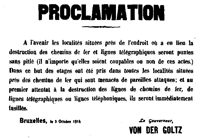 We call upon the Belgian population not to infringe this notice. Those who do not comply with this notice will be brought before the Imperial Officers of Justice and we warn them that the penalty of death may be inflicted upon them.