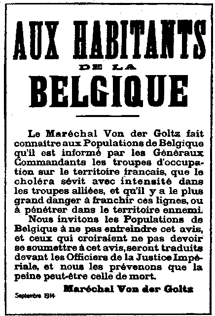Field-Marshal von der Goltz announces to the Belgian population that he is informed by the Generals commanding the troops occupying French territory that cholera is raging fiercely among the allied troops and that there is the greatest danger in crossing the lines or entering enemy territory.