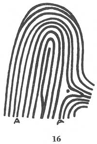 Figure 11 is a typical loop. Lines A and B, which have been emphasized in this sketch, are the type lines, starting parallel, diverging at the line C and surrounding the pattern area, which is emphasized in figure 12 by eliminating all the ridges within the pattern area.