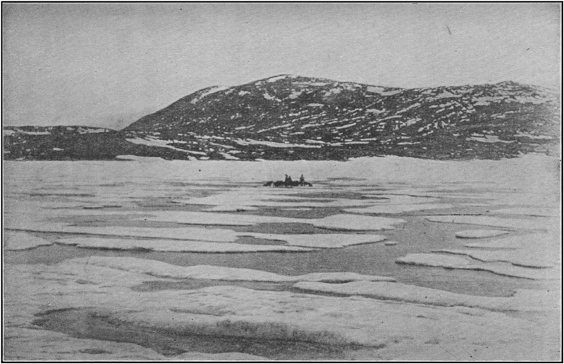 I had not drifted more than half[20] a mile before I saw my poor komatik disappear through the ice, which was every minute loosening up into the small pans that it consisted of, and it seemed like a friend gone and one more tie with home and safety lost. To the northward, about a mile distant, lay the mainland along which I had passed so merrily in the morning,—only, it seemed, a few moments before.