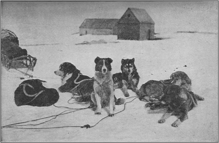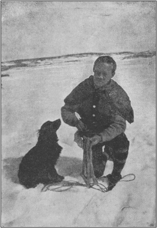 Each time I sat down to rest, my big dog "Doc" came and kissed my face and then walked to the edge of the ice-pan, returning again to where I was huddled up, as if to say, "Why don't you come along? Surely it is time to start." The other dogs also were now moving about very restlessly, occasionally trying to satisfy[38] their hunger by gnawing at the dead bodies of their brothers.