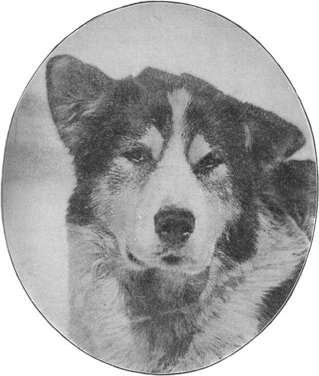 This dog has weird black markings on his face, giving him the appearance of wearing a perpetual grin. After climbing out on the snow as if it were the most natural position in[10] the world he deliberately shook the ice and water from his long coat, and then turned round to look for me. As he sat perched up there out of the water he seemed to be grinning with satisfaction. The other dogs were hopelessly bogged. Indeed, we were like flies in treacle.