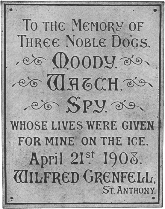 It is time to bring this egotistic narrative to an end. "Jack" lies curled up by my feet while I write this short account. "Brin" is once again leading and lording it over his fellows. "Doc" and the other survivors are not forgotten, now that we have again returned to the less romantic episodes of a mission hospital life. There stands in our hallway a bronze tablet to the memory of three noble dogs, Moody, Watch, and Spy, whose lives were given for mine on the ice.[56] In my home in England my brother has placed a duplicate tablet, and has added these words, "Not one of them is forgotten before your Father which is in heaven." And this I most fully believe to be true. The boy whose life I was intent on saving was brought to the hospital a day or two later in a boat, the ice having cleared off the coast not to return for that season. He was operated on successfully, and is even now on the high road to recovery. We all love life. I was glad to be back once more with possibly a new lease of it before me. I had learned on the pan many things, but chiefly that the one cause for regret, when we look back on a life which we think is closed forever, will be the fact that we have wasted its opportunities. As I went to sleep that[57] first night there still rang in my ears the same verse of the old hymn which had been my companion on the ice, "Thy will, not mine, O Lord."