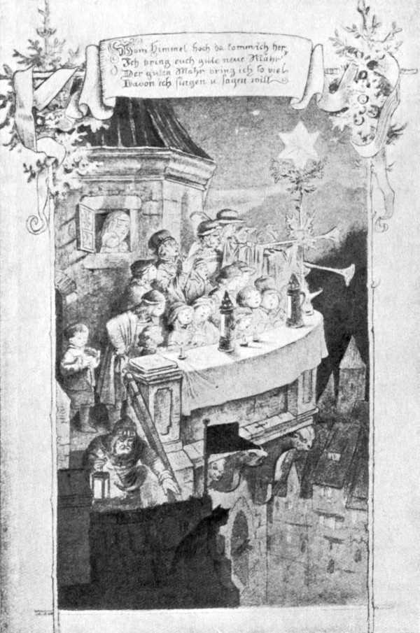 In the fourteenth century we find a blossoming forth of Christmas poetry in another land, Germany.{16} There are indeed Christmas and Epiphany passages in a poetical Life of Christ by Otfrid of Weissenburg in the ninth century, and a twelfth-century poem by Spervogel, “Er ist gewaltic unde starc,” opens with a mention of Christmas, but these are of little importance for us. The fourteenth century shows the first real outburst, and that is traceable, in part at least, to the mystical movement in the Rhineland caused by the preaching of the great Dominican, Eckhart of Strasburg, and his followers. It was a movement towards inward piety as distinguished from, though not excluding, external observances, which made its way largely by sermons listened to by great congregations in the towns. Its impulse came not from the monasteries proper, but from the convents of Dominican friars, and it was for Germany in the fourteenth century something like what Franciscanism had been for Italy in the thirteenth. One of the central doctrines of the school 43was that of the Divine Birth in the soul of the believer; according to Eckhart the soul comes into immediate union with God by “bringing forth the Son” within itself; the historic Christ is the symbol of the divine humanity to which the soul should rise: “when the soul bringeth forth the Son,” he says, “it is happier than Mary.”{17} Several Christmas sermons by Eckhart have been preserved; one of them ends with the prayer, “To this Birth may that God, who to-day is new born as man, bring us, that we, poor children of earth, may be born in Him as God; to this may He bring us eternally! Amen.”{18} With this profound doctrine of the Divine Birth, it was natural that the German mystics should enter deeply into the festival of Christmas, and one of the earliest of German Christmas carols, “Es komt ein schif geladen,” is the work of Eckhart's disciple, John Tauler (d. 1361). It is perhaps an adaptation of a secular song:—