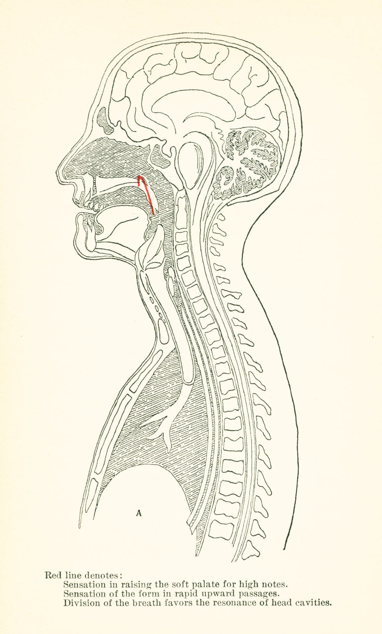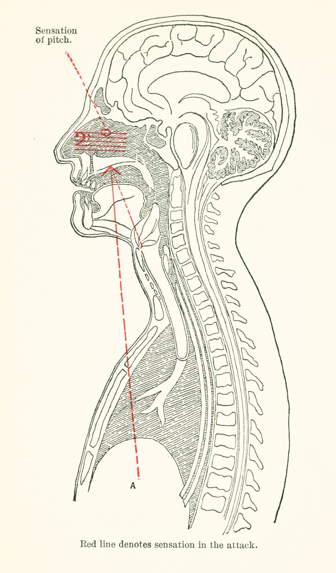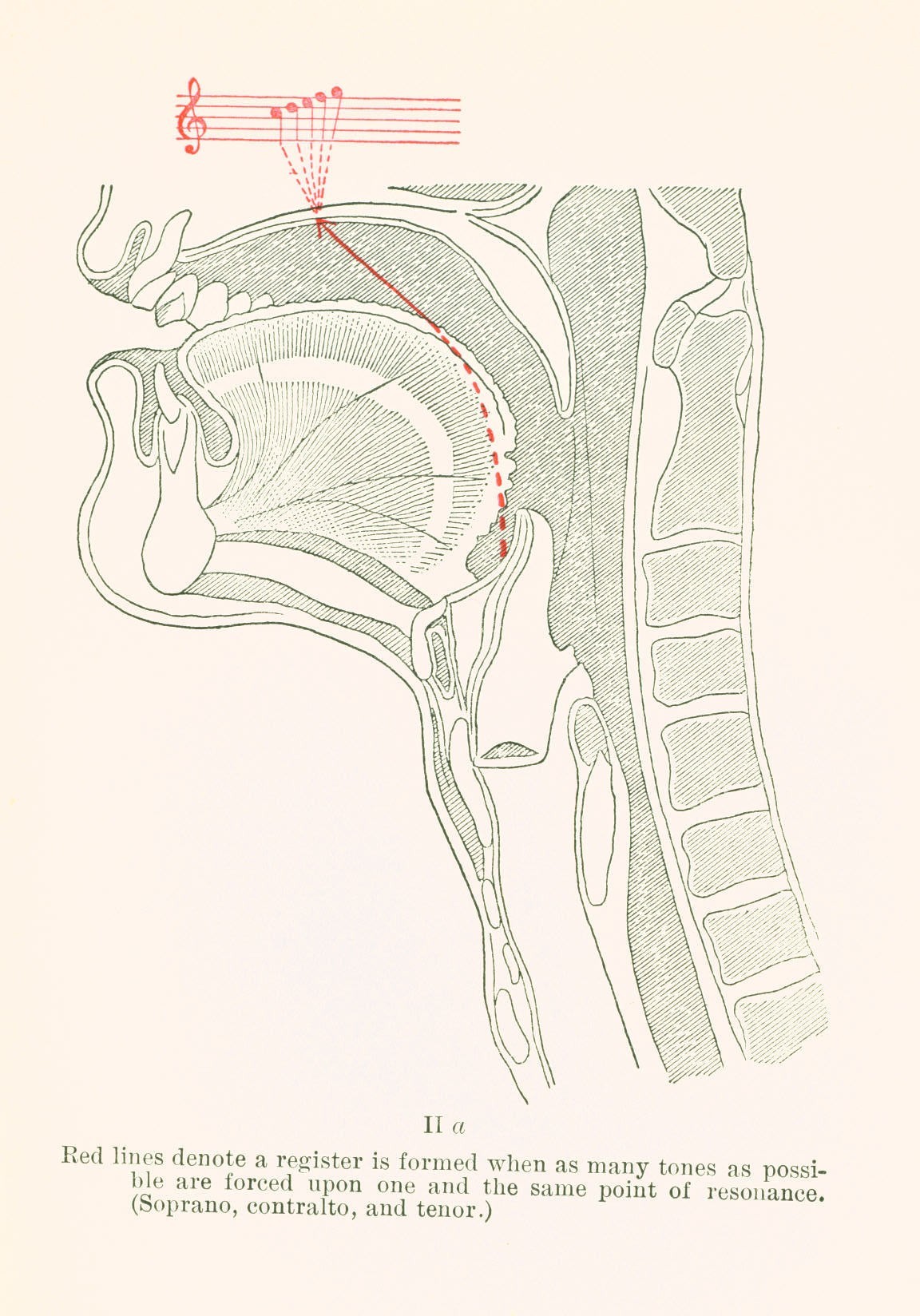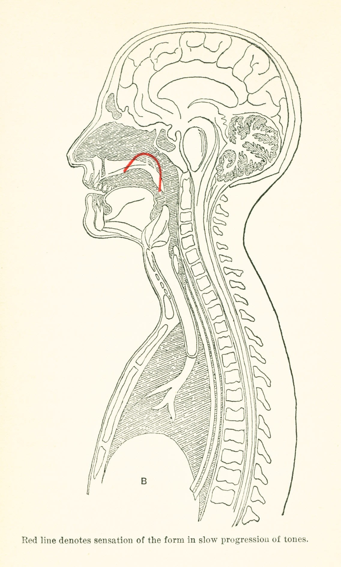 To me it is always as if the pitch of the highest tone were already contained in the lowest, so strongly concentrated upon the whole figure are my thoughts at the attack of a single tone. By means of ah-e-ā, larynx, tongue, and palatal position on the lowest tone are in such a position that the vibrations of breath for the highest tones are already finding admission into the head cavities, and as far as possible are in sympathetic vibration there.