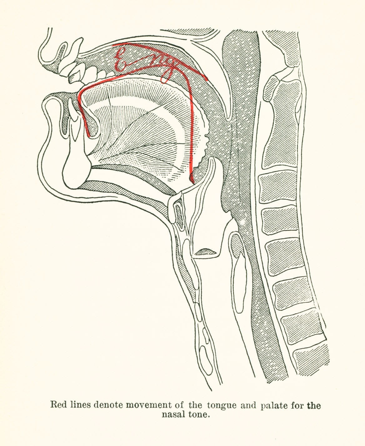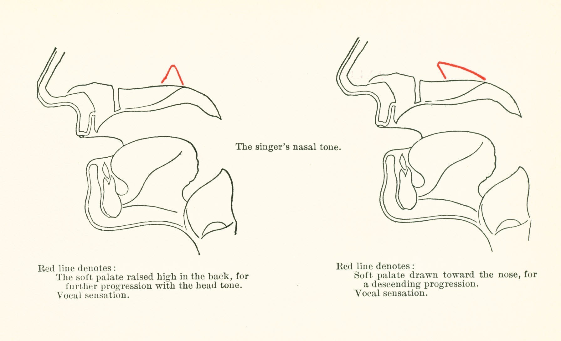 but must be nasally modified above, and tied; and because the breath must flow out unceasingly in a powerful stream from the vocal cords, an h can only be put in beneath, which makes us sure of this powerful streaming out of the breath, and helps only the[Pg 249] branch stream of breath into the cavities of the head. Often singers hold the breath, concentrated on the nasal form, firmly on the lowest tone of a figure, and, without interrupting this nasal form, or the head tones, that is, the breath vibrating in the head cavities, finish the figure alone. When this happens the muscular contractions of the throat, tongue, and palate are very strong.
