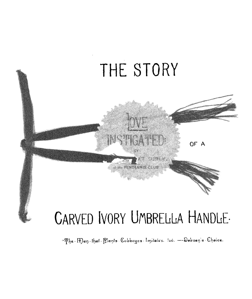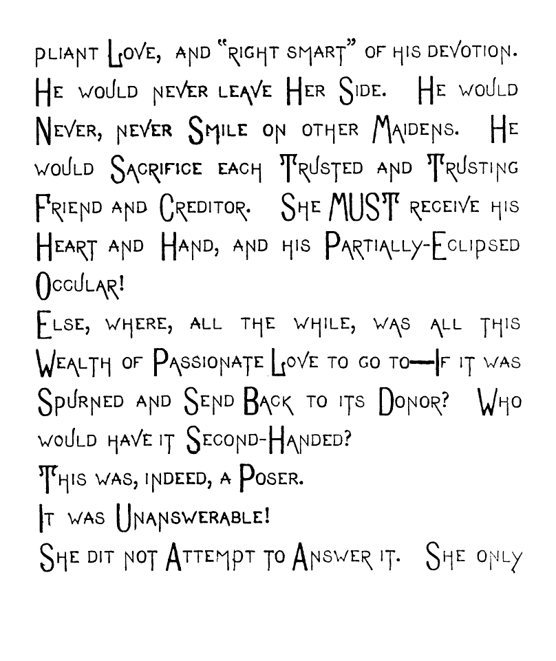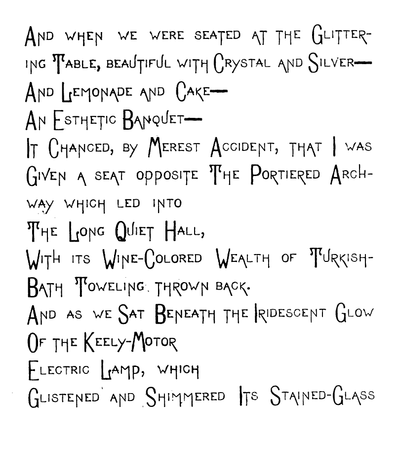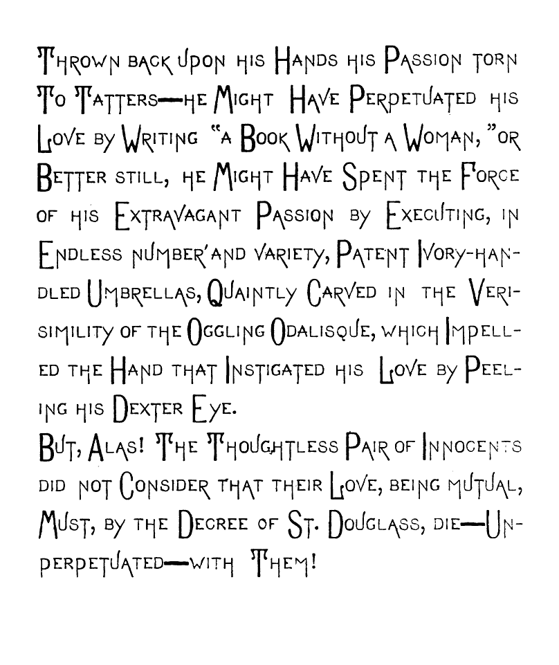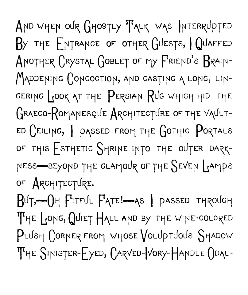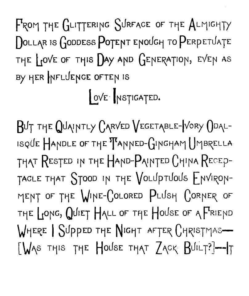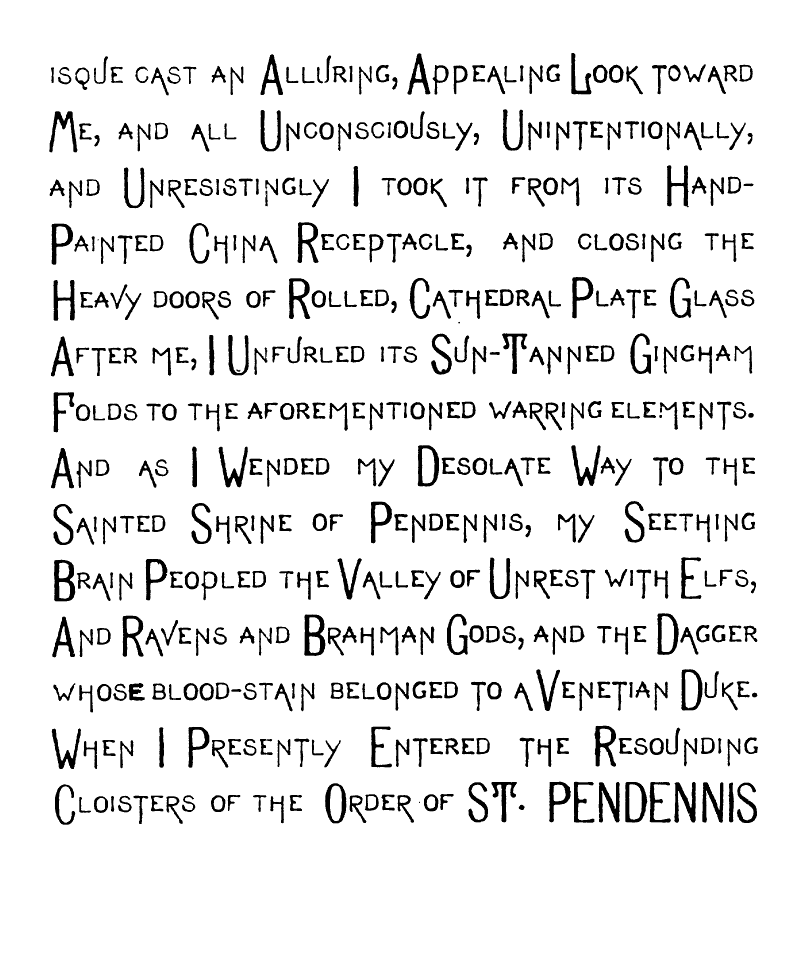 But,—Oh Fitful Fate!—as I passed though The Long, Quiet Hall and by the wine-colored Plush Corner from whose Voluptuous Shadow The Sinister-Eyed, Carved-Ivory-Handle Odalisque [img] cast an Alluring, Appealing Look toward Me, and all Unconsciously, Unintentionally, and Unresistingly I Took it from its Hand-Painted China Receptacle, and closing the Heavy doors of Rolled, Cathedral Plate Glass After me, I Unfurled its Sun-Tanned Gingham Folds to the aforementioned warring elements. And as I Wended my Desolate Way to the Sainted Shrine of Pendennis, my Seething Brain Peopled the Valley of Unrest with Elfs, And Ravens and Brahman Gods, and the Dagger whose blood-stain belonged to a Venetian Duke. When I Presently Entered the Resounding Cloisters of the Order of ST. PENDENNIS—when [img] I entered this "House without a Woman" I sought the seclusion of a dark, Wine-Colored, Plush-Lined Cell, and carelessly placing the Tanned Gingham, Vegetable-Ivory-handled Umbrella on the Eighteenth Century Hearth before me,