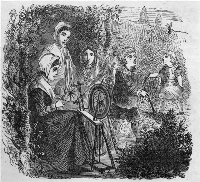 Master Drury's household was managed by his sister, an elderly lady, who looked after children and servants with the greatest watchfulness, lest a moment of their time should be wasted. It was the rule of the household that as soon as breakfast was over Mistress Mabel should take her place in the high-backed chair at the head of the table in the "keeping room," or general sitting-room, and with Bessie and Bertram on each side of her, at their lessons, a huge basket of work was brought to her side by one of the maids, and Mary and Maud were each set to work, making or mending garments for the family. Fancy-work was never heard of in those days, and Mistress Mabel would not have allowed any to be brought forward in her presence, if it had been. Sometimes, as a rare treat, when the lessons were well learned, a book was fetched from the library, not a story-book—that would have been a waste of time, according to this lady's rule—but a learned treatise on some abstruse science, which generally set Bessie and Bertram yawning, so that the reading was not much of a treat to them. Talking was not allowed from any one until the children's lessons were learned, and not greatly indulged in then. Later in the day, after the dairy had been visited and the kitchen inspected, the spinning-wheels were brought out, and the maids, who had finished their household and dairy work, were set down to spin.
