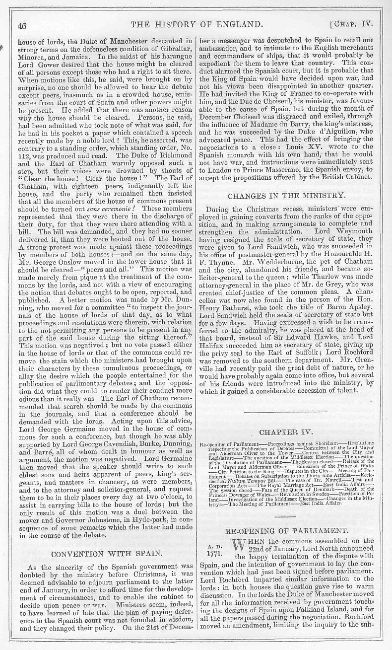 There was no part of the conduct of the Whig administration which had been made the subject of more incessant attack than that which related to their foreign policy. This session the line of policy followed by Lord Palmerston in reference to Spain afforded a subject for declamation against him and his coadjutors in the government. At this time British soldiers were fighting in that country without the protection of the British flag, exposed to all the shame and hardships of a disastrous and disgraceful war. In the midst of the public anxiety on this subject, it was brought forward in the house of commons by Lord Mahon, who had been under-secretary for foreign affairs during Sir Robert Peel’s administration. His lordship began by expressing a want of confidence in government, and especially in Lord Palmerston: the country, he said, had too long reposed a confidence in his exertions, to which he was neither entitled by prudence nor success. He complained that the public had been kept in a state of ignorance as to whether they were in peace or at war: in his opinion it was a peace without tranquillity, and a war without honour. The object of the quadruple alliance had been to appease the civil dissensions in Portugal; not to sanction the intervention of France and England in Spain. He did not object to this, but he lamented the policy which led to the additional articles signed in 1834, which stipulated for a certain degree of interference. The Duke of Wellington, during the four months he had been in office, had acted up to the spirit of those articles, as he was bound to do; but Lord Palmerston had thought proper to proceed still further, in suspending the foreign enlistment act, and allowing twelve thousand Englishmen to enlist under the banners of the queen. Lord Mahon went on to contrast our position throughout the peninsular campaign. The great object had then been to drive the French out of the Peninsula, an object which had been sanctioned by all our greatest statesmen for more than a century and a half. Lord Palmerston had, however, departed from this line of policy. Count Mole, the prime minister of France, said in the chamber of deputies that “Lord Palmerston considered that circumstances justified the co-operation of France; and that in March, 1836, he notified to General Sebastiani, that it was his intention to land a certain force of marines on the coast of Spain, and invited France to join in that co-operation.” At the same time he had offered France the occupation of the port of Passages, and left to her own option the mode and extent of co-operation. M. Thiers had, however, declined the invitation. Next came the revolution of La Grunja, and soon after that event, an increased force was sent to relieve ‘Bilboa. More than £540,000 had already been expended in the war, and all the accounts were not as yet sent in. In Lord Mahon’s opinion, the influence of Great Britain in Spain had not been augmented by these measures; and in proof of it, he quoted a memorial presented by the British merchants of Alicant, complaining that their interests had been neglected; and that while England carried away three-fourths of the produce of Spain, that country took very little in return. To illustrate still further the decline of our influence with the court of Madrid, Lord Mali on alluded to a tax imposed on British subjects. “For the liberation of the king,” originally levied during the captivity of King Ferdinand. This impost had been kept up though the king was now dead. There were other grievances of a similar kind: the only one redressed was a tax on military quarters, which had been ceded to the English residents. Lord Mahon concluded by calling Lord Palmerston’s attention to the provinces of Biscay and Navarre, which had been deprived of their legal rights and privileges; and by stating that in bringing the subject forward, he was not actuated by any partiality for the character of Don Carlos, or any desire of advocating his claims on the crown of Spain. Mr. Cutlar Fergusson, while he admired the moderate and gentlemanly tone of Lord Mahon’s speech, yet differed from his views. He defended the alteration which Ferdinand had made in the succession, and which had been approved of by the Cortes, while they looked upon Don Carlos as a pretender. The question for the house was whether this country was not justified in abiding by the terms of the quadripartite treaty. We had done no more, he said, till Don Carlos had published the edict of Durango: after that infamous act an important article had been appended to the treaty, stipulating that arms and stores should be supplied for the maintenance of the war, and, if necessary, a naval force. Mr. Gaily Knight also dissented from Mr. Fergusson’s views; while Mr. Fenton expressed his disapprobation of Lord Palmerston’s policy. Lord Francis Egerton said that in his opinion we were not the proper judges of the value of those rights and privileges for which the Basques were contending; if they themselves held them dear, every Englishman must feel a sympathy in their cause. Mr. Fergusson had admitted, that could we have foreseen the failure of the Spanish generals, it would have altered the question as to the policy of suspending the foreign enlistment act: were not ministers culpable for such a want of foresight? Surely Lord Palmerston and his colleagues might have distinguished between Spain in the sixteenth century, when her troops were the first in Europe, and Spain during the peninsular war. Had not Lord Palmerston been in office during the war of independence? And had not its records taught him something of Spanish generals and Spanish promises? At any rate, a glance at the pages of a Napier, or a word from the Duke of Wellington would have enlightened him on the subject. Mr. Cutlar Fergusson explained, and Mr. Poulter protested against the doctrine which stigmatized the conduct of government as intervention. Mr. Grove P