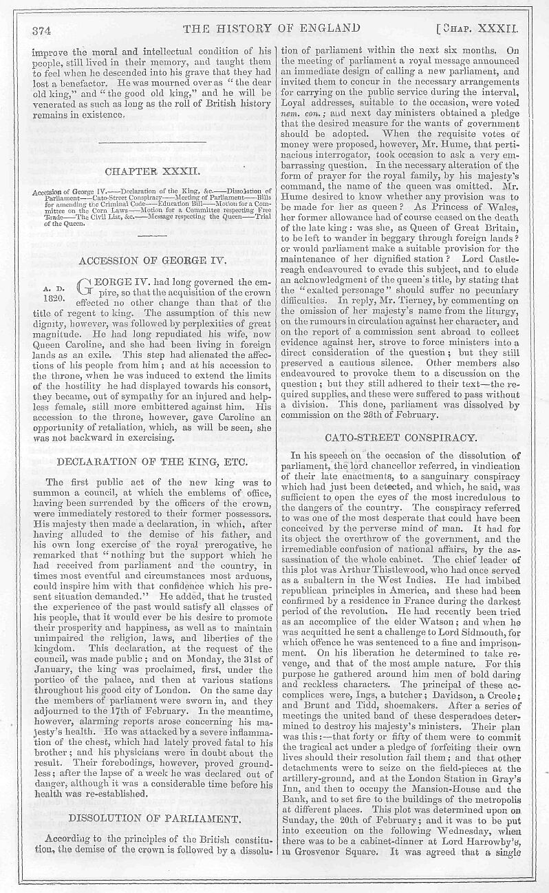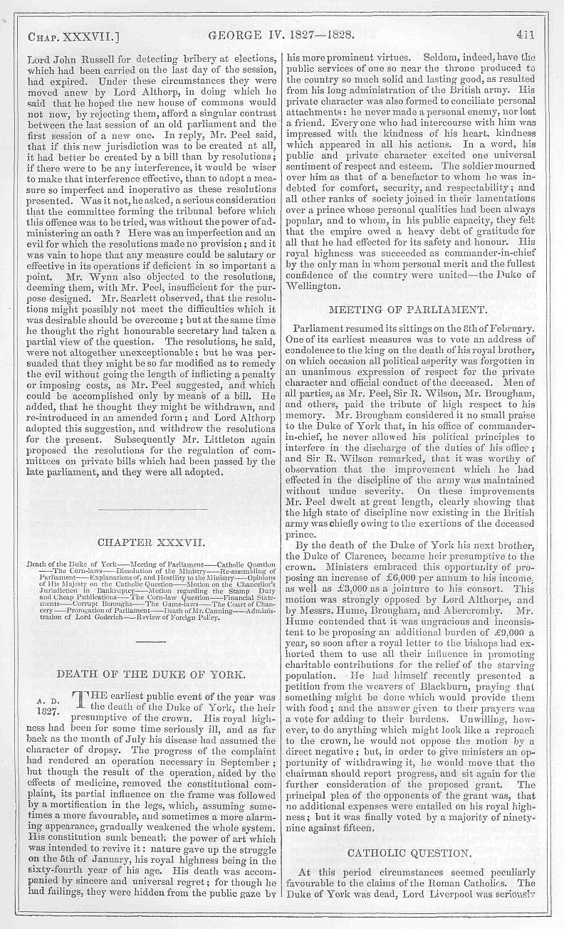 Ever since his accession to the throne, the king’s health had in general been good. In the course of the present spring, however, symptoms of decline began to show themselves; and they increased so rapidly, that by the beginning of June his situation became one of serious alarm to his family. His majesty continued to transact business, but it was under such oppressive weakness, that it was clear to his medical attendants that his end was approaching. There was no active disease, indeed, but a general languor and weakness, which foretokened dissolution. His last days were spent in preparing for eternity; nothing seemed to give him greater pleasure than the presence of the Archbishop of Canterbury, who attended him, and from whose hands he received the sacrament. His deportment at this solemn ceremony, as related by a church dignitary, was fully edifying. He says:—“His majesty had already experienced the blessed consolations of religion, and removed the doubts his anxious attendants were entertaining, by eagerly desiring the queen to send for the archbishop, seeming, as it were, anxious to ratify the discharge of his earthly by the performance of his spiritual duties. His grace promptly attended, attired in his robes, and at a quarter to eleven administered the sacrament to his majesty and the queen, Lady Mary Fox communicating at the same time. The king was very calm and collected; his faculties were quite clear, and he paid the greatest attention to the service, following it in the prayer-book, which lay on the table before him. His voice indeed failed, but his humble demeanour and uplifted eyes gave expression to the feeling of devotion and of gratitude to the Almighty which his faltering lips refused to utter. The performance of this act of religion, and this public attestation of his communion with that church, for the welfare and prosperity of which he had more than once during his illness ejaculated short but fervent prayers, was the source of great and manifest comfort to his majesty. Though the shorter form had been adopted by the archbishop, his majesty was nevertheless rather exhausted by the duration and solemnity of the ceremony; but as his grace retired, the king said, with that peculiar kindness of manner by which he was so much distinguished, and at the same time gently moving his hand and inclining his head, ‘God bless you! a thousand, thousand thanks!’ There cannot be more certain evidence of the inward strength and satisfaction which the king derived from this office of religion than that, in spite of great physical exertion, his majesty, after the lapse of an hour, again requested the attendance of the archbishop, who, in compliance with the wishes of the queen, read the prayer for the evening service, with the happiest effect on the king’s spirits. This being done, the archbishop, naturally fearing the consequences of so much mental exertion on his majesty’s debilitated frame, was about to retire, when the king motioned him to sit down at the table, on the opposite side of which he himself was seated. His majesty was too weak to hold any conversation, but his spirits seemed soothed and comforted by the presence of the archbishop, on whose venerable, benign countenance his majesty’s eye reposed with real pleasure. The king at this interview stretched his hand across the table, and taking that of the archbishop, pressed it fervently, saying in a tone of voice which was only audible to the queen, who was seated near his majesty, ‘I am sure the archbishop is one of those persons who pray for me.’ The afternoon of this day witnessed a still further diminution of his majesty’s strength; but in proportion to the decay of his bodily power, was the increase of his spiritual hope and consolation. At nine o’clock in the evening the archbishop was again summoned by his majesty’s desire. The king was now still less able to converse than on the last occasion; but his grace remained more than three quarters of an hour, supplying by his presence the same comfort to the king, and receiving from his majesty the same silent though expressive proof of his satisfaction and gratitude. At length, on the suggestion of the queen that it was already late, and the archbishop might become fatigued, the king immediately signified his assent that he should retire; and crossing his hands upon his breast, and inclining his head, said, as his grace left the room, ‘God bless thee, dear, excellent, worthy man! a thousand, thousand thanks!’” This was on Sunday, the 18th of June, the anniversary of the battle of Waterloo, which the king remembered, expressing his desire that the Duke of Wellington should hold his usual banquet on the morrow. That was the day on which his majesty breathed his last. He had spent a tranquil night, but no corresponding effect was produced upon his health. Decaying nature could no longer be recruited by ordinary sources of strength and sustenance. His majesty rose at seven o’clock, for during his illness he had not been wholly confined to his bed, but there was much in his language and manner which bespoke his sense of approaching death. “I shall get up once more,” he said to the queen, “to do the business of the country.” After joining in the service for the visitation of the sick, performed by the Archbishop of Canterbury, in which his majesty’s demeanour was characterised by the most genuine spirit of devotion. Sir Herbert Taylor was summoned, and was directed to get all things ready. As it was Monday, however, there were no papers, and consequently there was no business to transact. In the evening the archbishop visited his majesty for the last time: at half-past ten the king was seized with a fainting fit, on which he was removed into his bed, and from this time his voice was not heard, except to pronounce the name of his valet. In less than an hour death reigned in the palace of the English monarchs. His majesty expired without