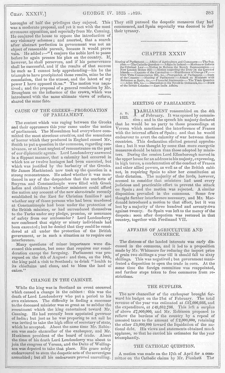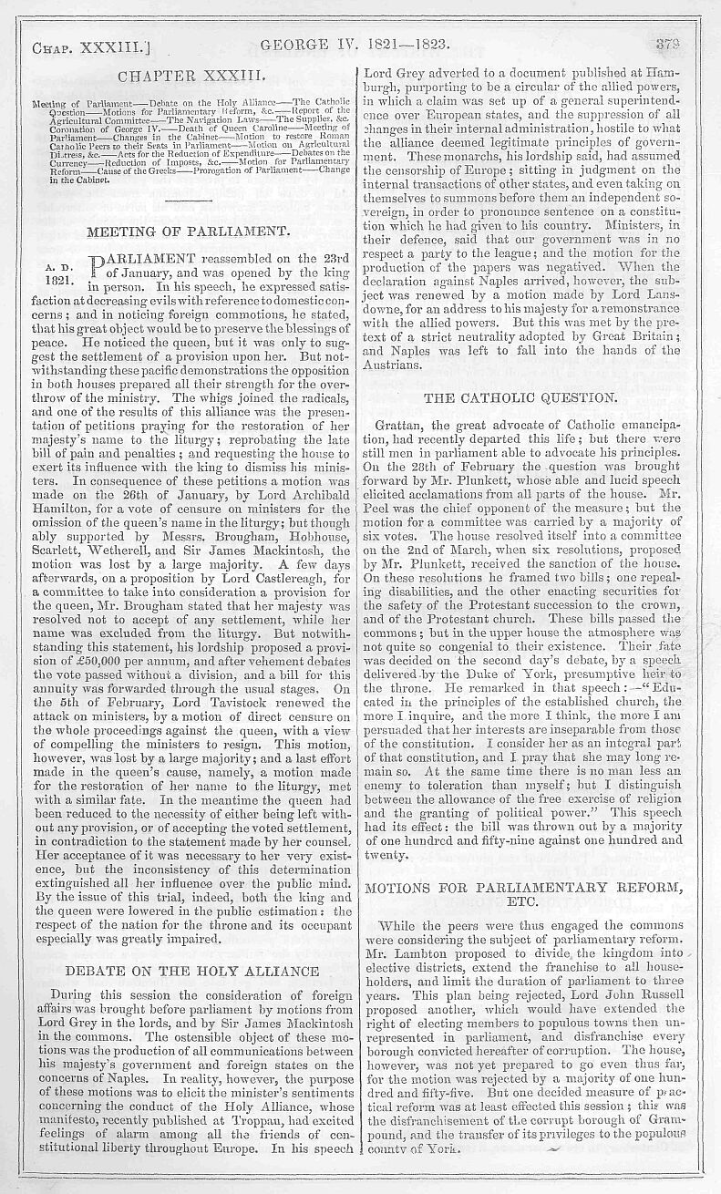 The bill was taken to the lords and read a first time on the same evening. Lord Melbourne moved the second reading on the 20th, and in doing so entered into a full explanation of the details of the bill, and emphatically called upon the peers to support it, as they valued the preservation of the monarchy, laws, and liberties of England. He would not say that monarchy was the best form of government that ever existed, but an attempt to alter it in this country would be the height of insanity and crime. The only opposition to the measure in the house of lords came from Lord Brougham, who contended that due consideration had not been employed either in the framing or passing of this bill. The wisdom of making a definite arrangement for the life of a sovereign who might be expected to reign for the next half century was questionable; and yet this was to be done, and a civil list voted which exceeded that of lier majesty’s predecessors, while parliament was left in the dark as to those very important revenues possessed by the crown, the incomes of the duchies of Cornwall and Lancaster. After a few words from the Duke of Wellington, who expressed his apprehensions that the bill did not contain a sufficient provision for pensions, the bill went through the committee, and was afterwards read a third time and passed without a division. It was customary that the royal assent should be given to bills of this nature in person, and the queen went in state to the house of lords on the 23rd of December for that purpose. On presenting the bill, the speaker observed, that it had been framed in “a liberal and confiding spirit,” on which the queen bowed her acknowledgment, and after the royal assent had been given to that and other bills, her majesty left the house.
