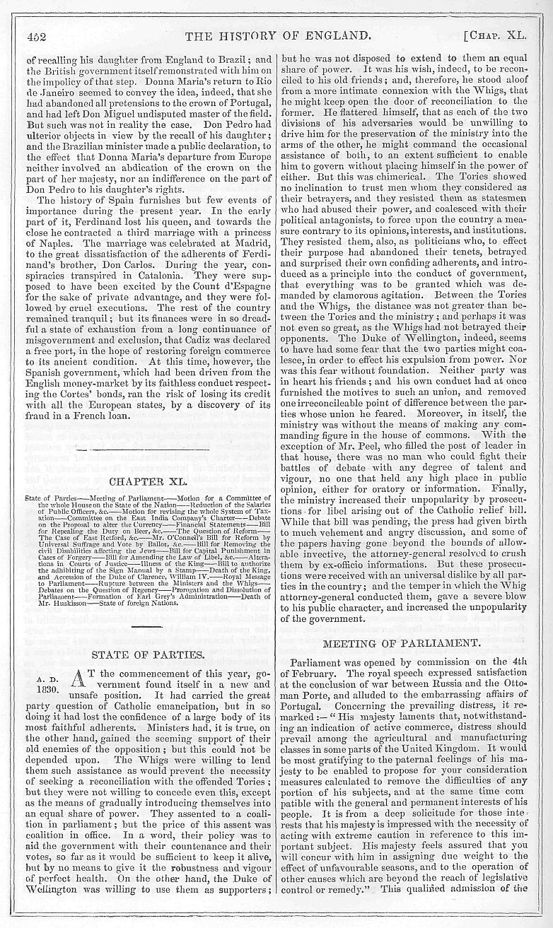 Queen Victoria ascended the throne at a period of perfect tranquillity. The popularity of the ministers was, indeed, declining, and they were surrounded with difficulties, partly from their own mismanagement of affairs, and partly from the position into which their eagerness for power had placed them. On the other hand the spirit of party was subsiding in the country: calm and impartial thinkers began to embrace a wider circle, yet it seemed clear that the administration could not have long existed had the late king lived a few months longer. His majesty had taken them back to his service with reluctance, and he was supposed to be on the watch for the first favourable opportunity of dismissing them. His demise, however, promised an increased stability to their power. Under their new sovereign they looked for a new order of things. She was believed to have been educated by her mother in principles and predilections favourable to their rule, and her countenance and support was expected to give not merely security, but popularity to their government. Nor did they fail to turn the event to good account. When pressed by their democratic allies to introduce organic measures for which they had no predilection themselves, it had been their practice to allege the king’s reluctance to proceed, as a reason for not falling in with their views. When, however, Queen Victoria ascended the throne, they eagerly declared their emancipation from the thraldom of an hostile court, and they proclaimed that the young queen had entered warmly into their views, and had espoused their political creed without reservation. Another considerable resource of popular appeal to the ministerial candidates was the alleged misdeeds of the new King of Hanover. Immediately upon his accession to the throne of that kingdom, his majesty had issued an ordinance, by which the then existing constitution was suspended; and it was thought this conduct of one who was an acknowledged leader of the Tories, might be represented to the disadvantage of that party. These, and other topics, were not without their weight with the multitude. Yet, with their assistance, the ministers had sufficient to do to maintain their previous position. By the end of July the elections for English cities and boroughs were nearly over, and the relative strength of parties was little changed as regarded the Whigs. In the county elections they underwent, indeed, a serious defalcation of strength; besides losing twenty-three seats, they failed in fifteen counties out of sixteen in which they endeavoured to substitute members of their own party for Conservatives. As for the Radicals, public opinion was still less in their favour: even Mr. Hume failed in being returned for Middlesex, and was driven to the necessity of appearing in the house as Mr. O’Connell’s nominee for Kilkenny. The Radicals, it is true, did not suffer numerically; but the absence of many of their leaders from the representation of important towns which they had hitherto represented, was significant of the waning popularity of extreme opinions. The loss, however, which ministers sustained in the English representation, was somewhat compensated by the returns of Scotland and Ireland. But while their numbers were not on the whole diminished, there was an evident falling off in quality. Their friends were not the representatives of such an extensive part of the population as they had been in the last parliament.