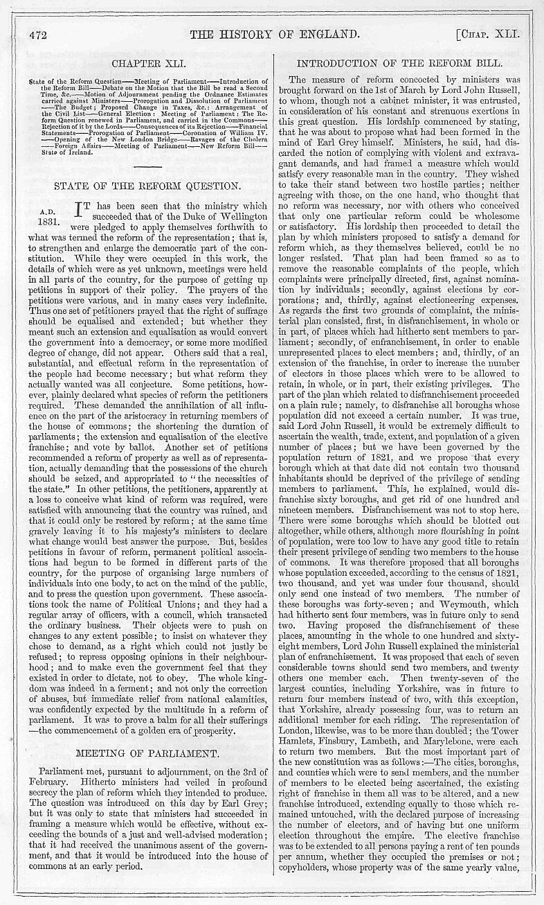 Before the Christmas recess, the freemen and parliamentary electors’ bill, which had been dropped in the preceding session, had been re-introduced. The two grand objects of this bill were to relieve householders entitled to the elective franchise, by extending the time fixed by the reform bill for payment of rates and taxes; and to remove the stamp-duty payable by freemen on their admission. The former part of the bill met with much opposition; and Mr. T. Duncombe moved an amendment, tending altogether to repeal the rate-paying clause of the reform act. This amendment, however, was rejected, and the original clause carried by a large majority. The third reading of the bill came on on the 19th of February, when it was condemned by Sir Robert Peel as involving a serious infraction of the great principle understood to be settled when the reform bill was passed. The bill was finally passed by the commons, by a majority of one hundred and eighty-nine against one hundred and seventy-two; but it was rejected in the house of lords on the second reading, on the 8th of March. The house of commons passed another bill, conceding tire desired relief to freemen alone; but the session closed before the lords were called upon to take it into consideration.