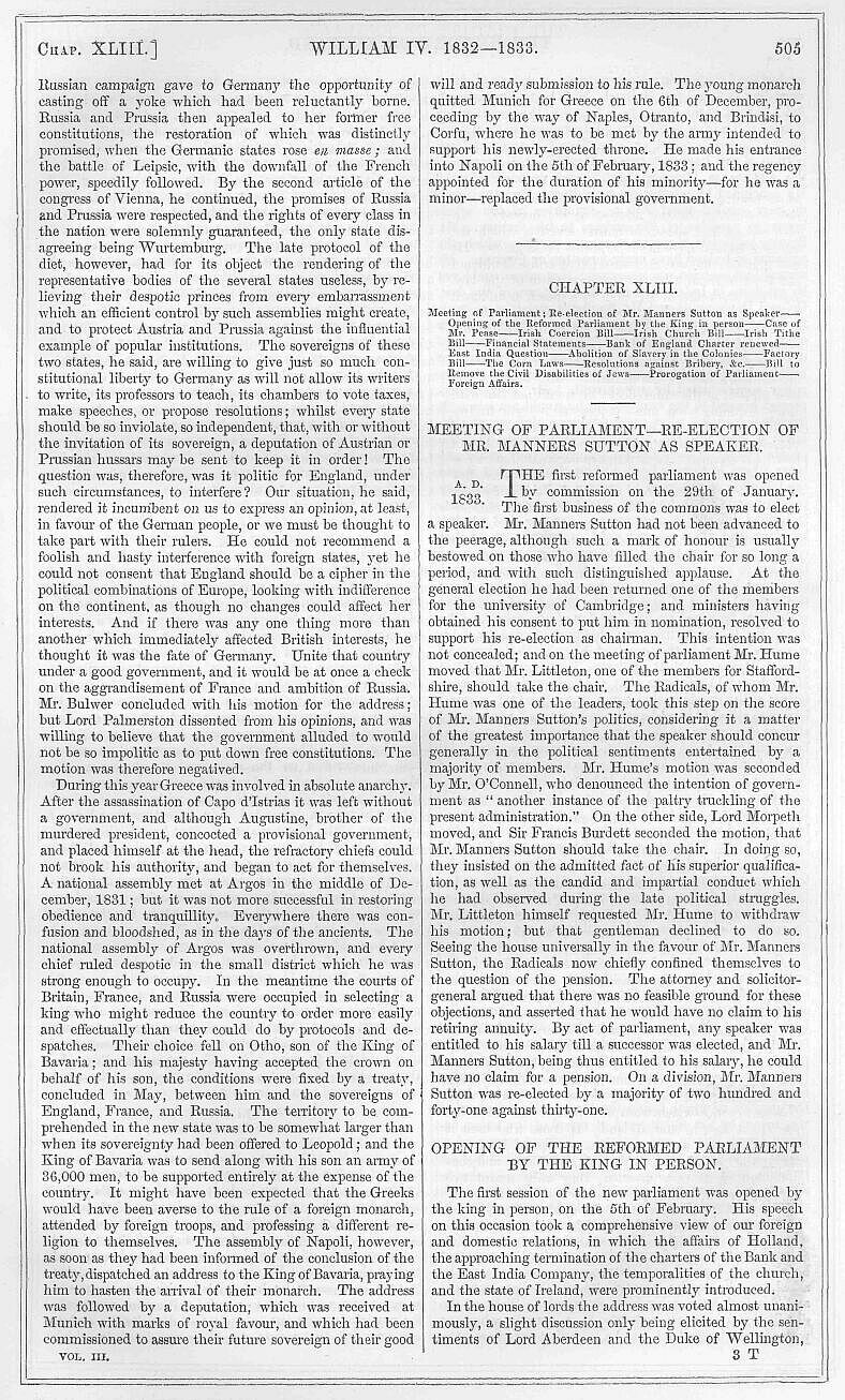 “My lords and gentlemen—The external peace and domestic tranquillity which at present happily prevail, are very favourable for the consideration of such measures of reformation and amendment as may be necessary or expedient, and your attention will naturally be directed to that course of legislation which was interrupted by the necessary dissolution of the last parliament. The result of the inquiries which have been made into the condition of the poor in Ireland has been already laid before parliament. And it will be your duty to consult whether it may not be wise and safe to establish by law some well-regulated means of relief for the destitute in that country. The municipal government of the cities and towns in Ireland calls for better regulation. The laws which govern the collection of the tithe-composition in Ireland require revision and amendment. Convinced that the better and more effectual administration of justice is amongst the first duties of a sovereign, I request your attention to those measures which will be submitted to you for the improvement of the law. You cannot but be sensible of the deep importance of these questions which I have submitted to you, and of the necessity of treating them in that spirit of impartiality and justice which affords the best hope of bringing them to a happy and useful termination. In meeting this parliament, the first that has been elected under my authority, I am anxious to declare my confidence in your loyalty and wisdom. The early age at which I am called to the sovereignty of this kingdom renders it a more imperative duty, that, under Divine Providence, I should place my reliance upon your cordial cooperation, and upon the love and affection of my people.”
