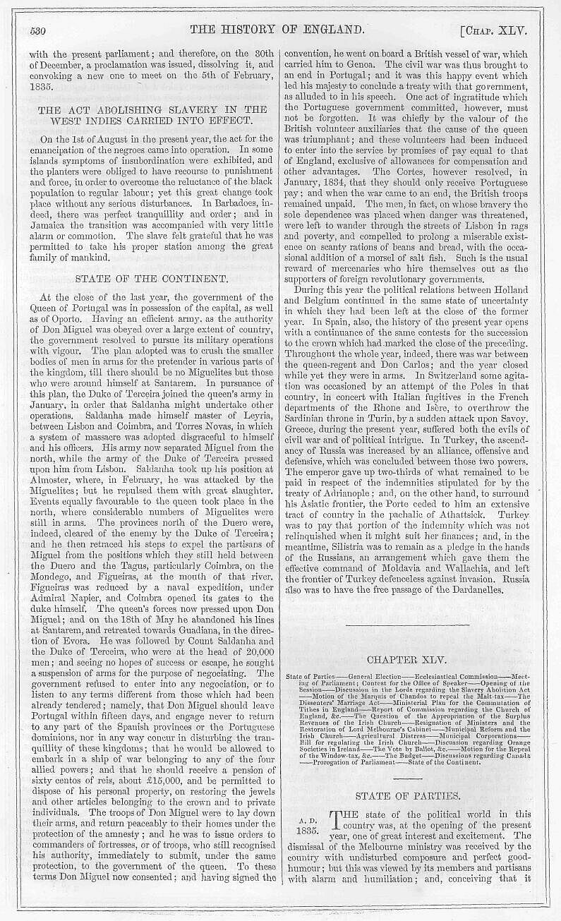 At this period anti-slavery agitation again became the order of the day. On the one hand there existed a large class of declaimers and needy orators who were interested in the revival of the subject; and on the other, there was a powerful body of humane people, to whom the contemplation of the sufferings of the negro people had become habitual, and who required little inducement to recur to such an exciting theme. But there was a cause for this display of philanthropy: the slave was still in chains, and was still suffering from the lash of the hard-hearted driver. The legislatures also in the colonies were not free from blame; they acted in many cases with obstinacy and intemperance; and Jamaica especially afforded many instances of systematic violations of the imperial law. The apprentice system, in point of fact, was a complete failure: it produced on the part of the slaves contumacy; and on the part of the masters breaches of the law, cruelty, and violence. From these circumstances there was no difficulty in lighting up a flame in England on the subject. Meetings were held and petitions got up, with a view of hastening the time when the slave should become a man among his fellow-men. The subject of slavery was brought before the house of lords, on the 29th of January, by Lord Brougham, who, after presenting a petition from Leeds, praying the immediate abolition of negro slavery, delivered an eloquent and impassioned speech on the enormities still committed in the slave-trade. The Duke of Wellington and Lord Glenelg admitted that Lord Brougham’s statements of the horrors of slavery were substantially correct. In his speech his lordship had said, that British officers were induced to allow vessels equipped for the slave-trade to escape, in order to secure the head-money, and to wait at the mouth of rivers till the cargoes had been shipped. Lord Minto, first lord of the admiralty, in reply, said, that he would not assert that no single instance of this nature had occurred; but he could say that none such had come to his knowledge, and that he did not believe a similar case had ever existed. He could assure their lordships that the only complaint he had heard against British officers thus employed, was, that they were too ready to take these vessels, and too little careful of themselves, not attending sufficiently to their own security against prosecutions. Every letter he received from those officers lamented the difficulties in the way of obtaining the means of the capture and conviction of these vessels until the cargo was embarked; and they all pressed for the conclusion of further treaties. If those treaties could be extended to all nations under whose flag the traffic was carrying on, there would be no difficulty in putting it down. The case was not the same with respect to Spain as to Portugal. With the former there was a treaty which enabled us to capture all slavers under her flag; but our cruisers could not capture vessels under Portuguese colours until they had taken in their cargoes. Lord Brougham asked, if a reward according to the tonnage of the vessel captured could not be substituted for head-money? His views were supported by Lords Ellenborough and Ashburton, the latter of whom said strong measures should be taken to compel Portugal to desist from the traffic. Lord Glenelg said, that Lord Palmerston was engaged in negotiating a treaty with that country, with a view of putting a stop to the trade. He thought with Lord Brougham that our interference had aggravated the horrors of slavery; but at the same time he contended that parliament had no alternative but to act as it had done; and that the fear of increasing the evil ought not to have prevented us from taking steps to extirpate the practice. The conversation on this subject here dropped; but it was renewed again on the 20th of February by Lord Brougham, who urged upon the house the propriety of immediately emancipating the negro apprentices. His speech on this occasion gained for him the golden opinions of the good and the wise. He commenced by painting in poetic language the “delicate, calm, and tranquil joy” which pervaded the Antilles on the day when slavery ceased to exist. He continued to show that the predictions of those who had declared that labour would cease when slavery was abolished, had failed. Twice as much sugar was made under the new system; and one planter had said, that with twenty free labourers he could do the work of a hundred slaves. His lordship next proceeded to show that the slave-holders had not kept faith with this country, and that the condition of the negroes, instead of being made better, was in many respects worse than before. They were, he said, the victims of partial tribunals, and of excessive and illegal punishments; and he related the case of eleven females having perished from the punishments inflicted upon them, but whose deaths were, nevertheless, ascribed by a coroner’s jury to “the visitation of God.” At the conclusion of his speech his lordship, after moving that an address be presented to her majesty, beseeching her to take steps for the suppression of the slave-trade, laid these resolutions on the table:—“That the practice of paying head-money to British cruisers should be discontinued. That letters of marque should be issued to private individuals, empowering them to fit out vessels for the capture of slavers. That it was expedient that the period of prædial apprenticeship should cease on the 1st of August, 1838.” The resolutions also further indicated certain regulations for the protection of apprentices in the meantime. Lord Glenelg, in a powerful speech, objected to Lord Brougham’s propositions of issuing letters of marque to privateers, and the discontinuance of head-money. With respect to the condition of the apprentices in the West India colonies, he contended that the change had been more advantageous than Lord Brougham had supposed, although he a