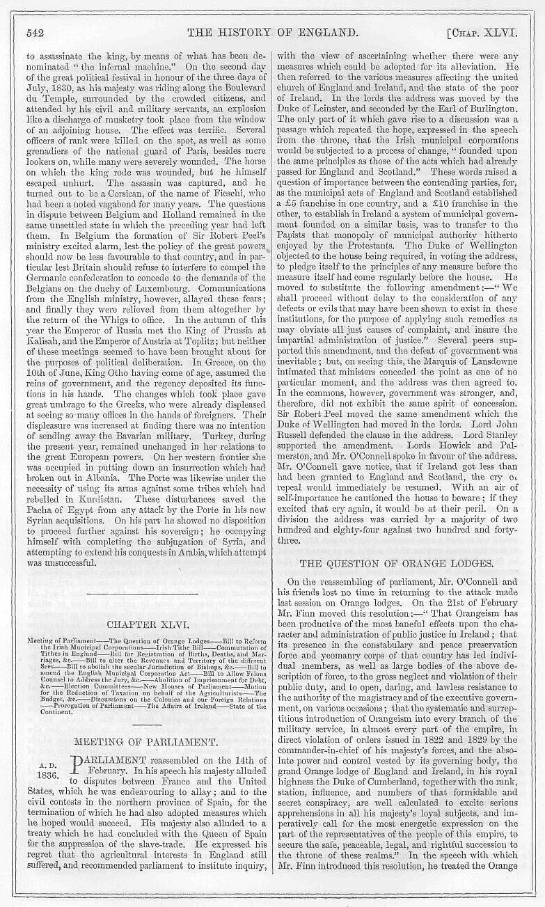 On the 14th of May Sir Thomas Acland moved for the repeal of the appropriation clause. Lord John Russell had previously given notice that he would bring forward his resolutions concerning Irish tithes; and in moving that the speaker should leave the chair, the noble lord said that it had been his original intention to refrain from saying a single word, and to reserve his remarks to the time when the house should go into committee. It had pleased the gentlemen opposite, however, to give notice that they meant to interpose another question in order to raise a debate, and produce a division, before allowing the resolutions to be considered in committee. He should consider the proposition made by Sir Thomas Acland in two points of view; with reference to its object of producing discord and bitterness of feeling in the house, and how far such a course was conformable to the professions made by gentlemen opposite with respect to the Irish church. After descanting at considerable length on the subject of the alliance of the church and state generally, and the small influence which the Irish church exercised over the people, the noble lord went on to unfold his scheme. The existing tithe-composition, he said, would be converted into a rent-charge at the rate of £70 for every £100; and he proposed that the rent-charge should, with a saving of existing interests, be redeemed by the government at the rate of sixteen years’ purchase on the full sum of £100. The money received in redemption of the rent-charge he proposed should be invested in land, or in such other way as the ecclesiastical commissioners should advise; and the rent-charges themselves, when purchased, should go towards a fund, from which £160,000 should be paid yearly to the constabulary force of Ireland; £20,000 to the Dublin police; £70,000 to the expense of criminal informations; and £100,000 for the purposes of education, instead of the £50,000 now voted annually for that purpose; any surplus was to be applied to charitable purposes. After developing his plan, Lord John Russell descanted on the obstinacy and exorbitance of the clergy, and then attacked Sir T. Acland’s motion. He commenced this part of his speech by quoting the Duke of Wellington’s declared desire to see the Irish questions brought to a settlement, contending that the present motion was not in accordance with that declaration. With respect to the principle of the appropriation resolutions, his opinion was unaltered: it was a wise and just principle, and he could not consent to its reversal: it would imply a stigma upon ministers which he could not endure. Sir Thomas Acland, however, rose to move that the resolutions of the 7th and 8th of April, 1835, should be read; and after addressing the house at considerable length, he further moved that they should be rescinded. The motion was seconded by Sir Eardley Wilmot. After a long speech from Lord Stanley, and a few words from Lord Morpeth in defence of government, the house was adjourned till the following day, when Mr. Litton renewed the discussion by delivering a speech in favour of Sir T. Acland’s amendment. Messrs. Young, Laseelles, Bennett, and Lord Sandon also supported it; while Messrs. Redington and Townley opposed it. Mr. O’Connell remarked that the real question before the house was, how should Ireland be governed? This was the question that had been under discussion for seven hundred years. Should Ireland, he asked, be governed by a section? A loud shout interrupted the speaker, and in the midst of continued uproar, he continued thus:—“I thank you for that shriek. Many a shout of insolent domination, despicable and contemptible as it is, have I heard against my country.”—[Here the speaker interfered]—“Let them shout; it is a senseless yell—the spirit of a party. Ireland will hear their shrieks. They may want us again. What would Waterloo have been if we had not been there? I ask not that question for the renowned commander-in-chief, who is himself an Irishman, but for the hardy soldiery of Ireland, who fought the battle for him. I say again, that is the question.” In conclusion, Mr. O’Connell admitted that the ministerial plan did not go far enough, but he was ready to accede to it for the sake of an amicable arrangement. Sir Robert Peel and other members addressed the house, a discussion ensued, when Sir Thomas Acland’s motion was lost by a majority of three hundred and seventeen against two hundred and ninety-eight. On the following day Lord John Russell gave the house distinctly to understand that the tithe measure would solely consist of a proposition to the effect that the composition then existing should be converted into a rent-charge.