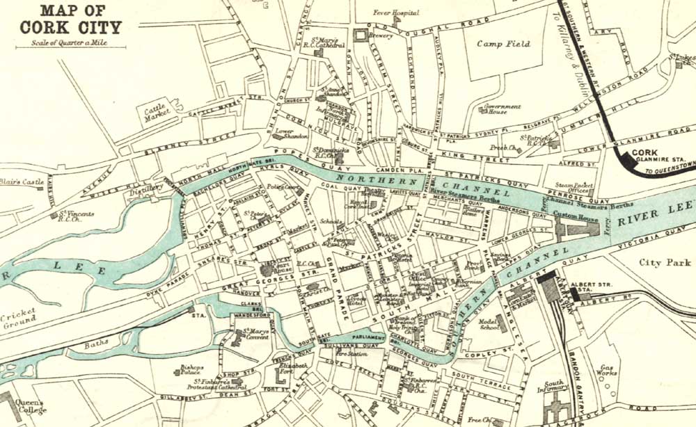 [2] The other places of worship in Cork are as follows:—Roman Catholic: St. Mary's Cathedral, Clarence-street; SS. Peter and Paul's, Patrick-street (designed by Pugin); St. Patrick's, King-street (Military Mass); St. Finbarr's, Dunbar-street (here Hogan's masterpiece, "The Dead Christ," may be seen under High Altar); St. Joseph's, Mayfield; St. Finbarr's, West, Lough-road; St. Augustine's Priory (Augustinians), Great George-street; St. Mary's (Dominicans), Pope's-quay; St. Francis' (Franciscans), Liberty-street; Holy Trinity (Friars Minors Capuchins), Charlotte-quay; St. Vincent's (Congregation of the Mission), Sunday's Well; and Chapel of Convent of St. Mary's of the Isle, Fitton-street. Church of Ireland: Christ Church, South Main-street; St. Ann's, Church-street; St. Luke's, Summer Hill; St. Mary's, Shanakiel-road; St. Nicholas', Cove-street; St. Paul's, Paul-street; St. Peter's, North Main-street; Cork Episcopal Free Church, Langford-row; St. Michael's, Blackrock; and Frankfield Church. Other Denominations: Baptist Church, King-street; Congregational Church, George-street; Patrick-street Methodist Chapel; Society of Friends, Grattan-street; Presbyterian, Summer Hill; Plymouth Brethren, Prince's-street; and Cork Hebrews, 10, South Terrace.