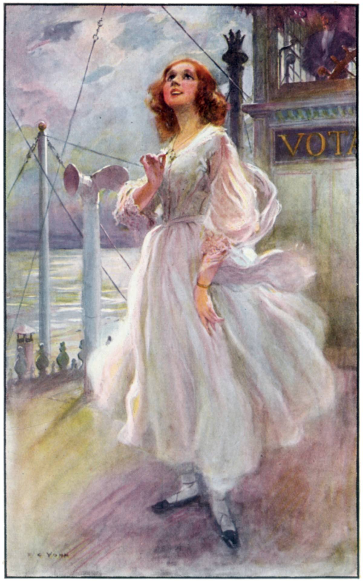 Meantime there was an odd stir on shore. A cab whirled up furiously and two more youths, shapely, handsome, and fashionable, twins beyond cavil and noticeably older than their twenty years, visibly rich in fine qualities but as visibly reckless as to what they did with them, sprang out, flushed and imperious, to wave the Votaress. One of her guards was still rubbing along the steamer beside her, but before the pair could dash aboard this other boat and half across her deck, a gap had opened, impossible to leap. They halted in rage as the more compact youth on the moving steamer's roof, catching their attention, pointed a good two miles up the river front. Yet what he said they would not have known had not her mate repeated from the forecastle: