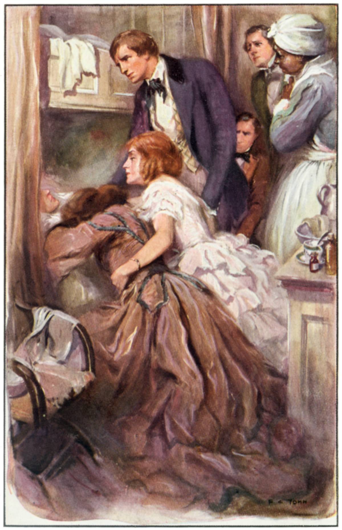 From his dizzy outlook the older youth dropped his calm scrutiny upon the inner occupants as they alighted and followed the boy on board. First came a red-ringleted, fifteen-year-old sister, fairly good-looking, almost too free of glance, and—to her high-perched critic—urgently eligible to longer skirts. Behind her appeared an old, very black nurse in very blue calico and very white turban and bosom kerchief; and lastly a mother—of many children, one would have said—still perfect in complexion, gracefully rounded, and beautiful.
