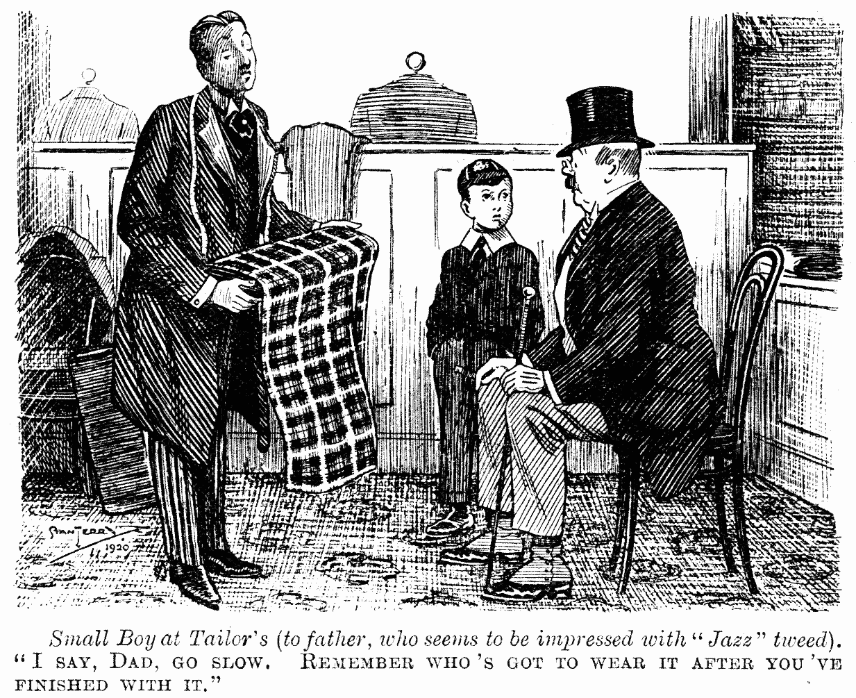 Small Boy at Tailor's (to father, who seems to be impressed with "Jazz" tweed).