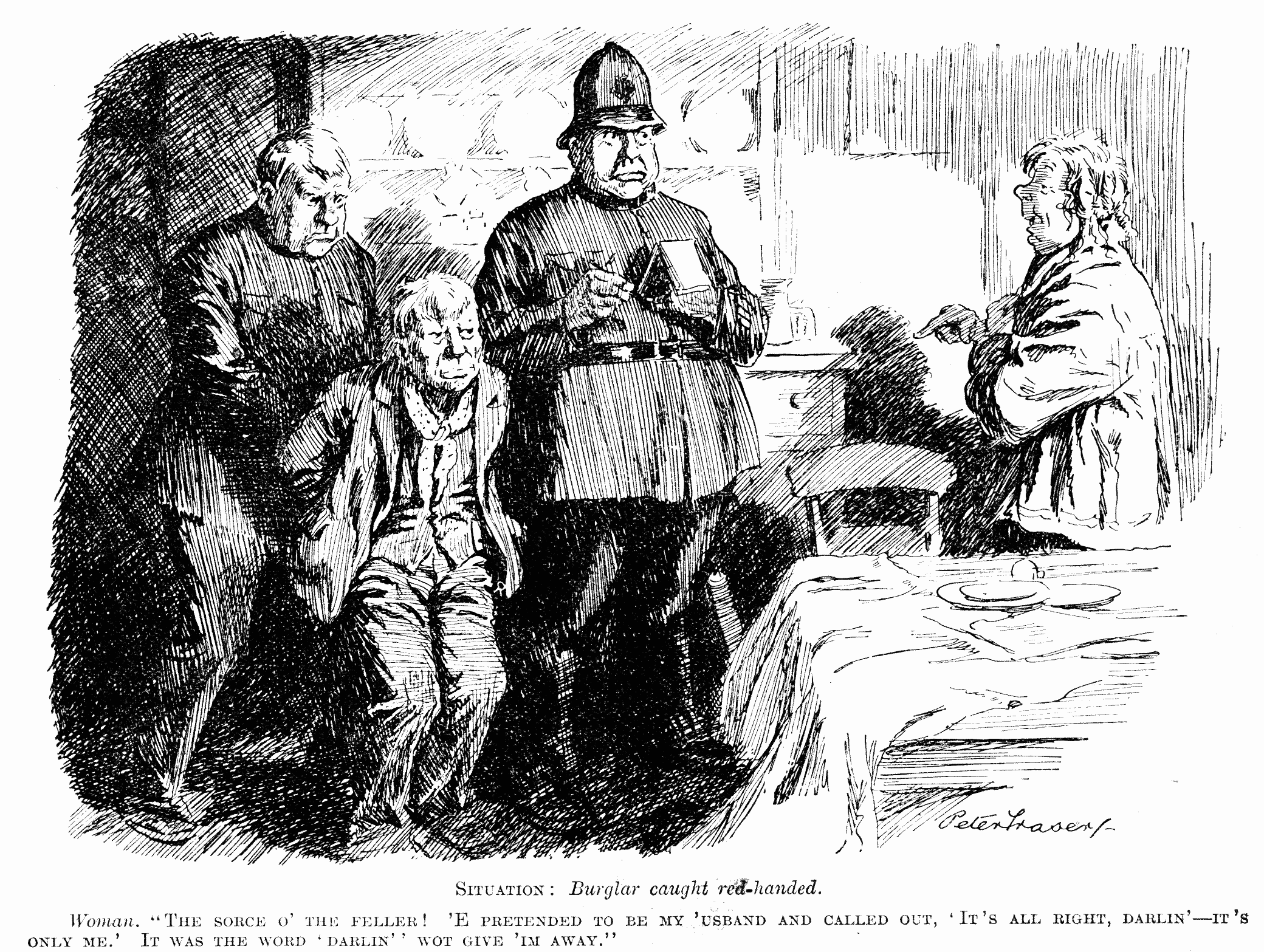 Woman. "The sorce o' the feller! 'E pretended to be me 'usband and called out, 'It's all right, darlin'—it's only me.' It was the word 'darlin'' wot give 'im away."