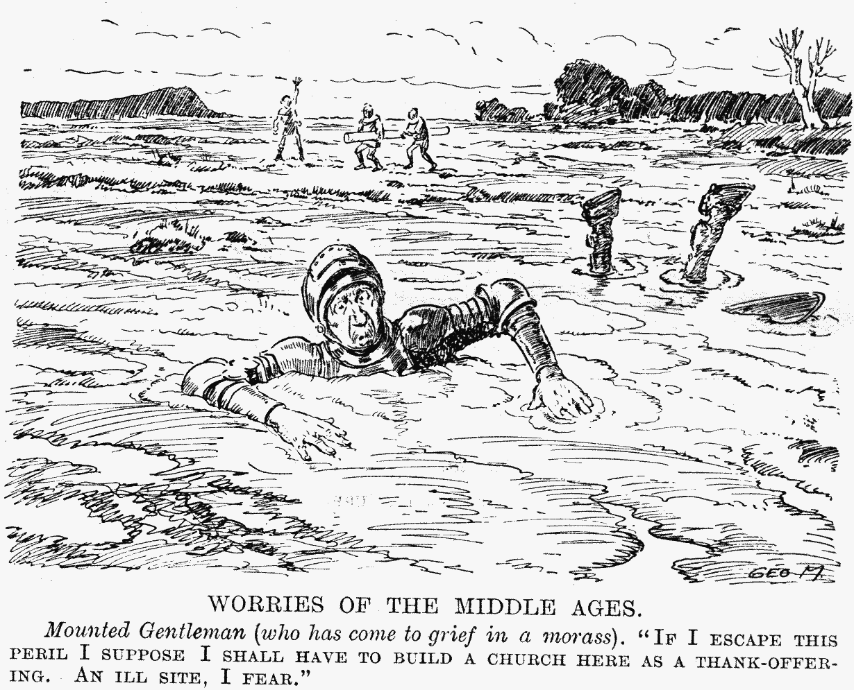 Mounted Gentleman (who has come to grief in a morass). "If I escape this peril I suppose I shall have to build a church here as a thank-offering. An ill site, I fear."