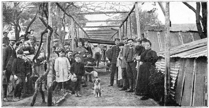 In den namiddag hebben wij onze tent van zeildoek verlaten, die anderen thans mogen gebruiken, als zij willen, en met behulp van stukken gegolfd plaatijzer, die wij wegnemen van een verwoest huis vlak bij ons, bouwen wij eene nieuwe schuilplaats. We hebben ons ook een paar matrassen weten te verschaffen en hopen, dat de volgende nacht beter zal zijn. We hebben ketels opgezet, en we koken in de open lucht. Het menu is niet zeer afwisselend; altijd Cassuela, een Chilisch gerecht, stukken gestoofd schapevleesch of kip, met rijst, meelknoedels, enz. We vormen een gezelschap van meer dan twintig personen, en we hebben maar twee of drie borden en evenveel lepels en vorken. We gebruiken die dus beurt voor beurt, zonder ze te wasschen natuurlijk, want het water is schaarsch en moet van ver weg gehaald worden; maar niemand trekt toch den neus op.