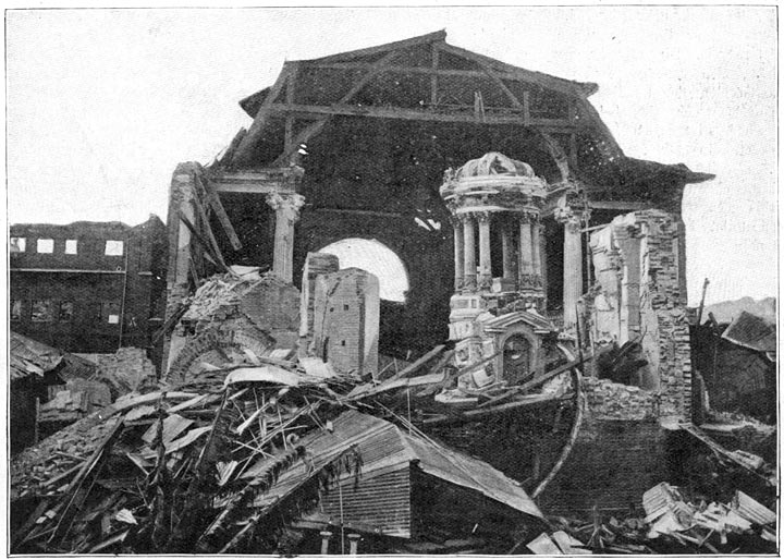 Er is een hevige wind opgestoken, die de vlammen aanwakkert. Het magazijn van den heer Potin, dat aan de aardbeving was ontsnapt, is later geheel door den brand verwoest. Zijn woonhuis ligt in puin; maar zijne familie is gered. Zijn zoon heeft een telegram naar Parijs gezonden en hij is thans op de terugreis. Die man heeft zijn geheele leven gewerkt, zich eene goede positie verworven en is in een enkelen dag totaal geruïneerd; want de verzekeringsmaatschappijen hebben reeds gezegd, dat zij de schade niet zullen vergoeden. En hoeveel anderen verkeeren in hetzelfde geval!