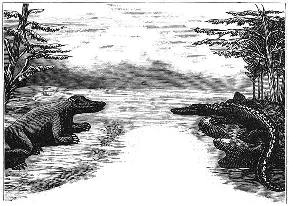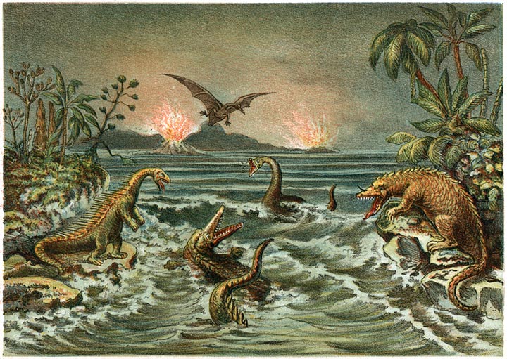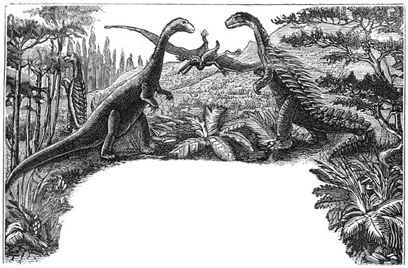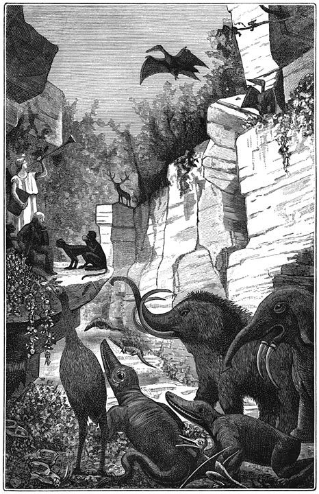 Gaan wij nog verder terug in de geschiedenis der aarde, dan komen wij op een tijdstip, waarop de oppervlakte van Europa nog veel meer afweek van hare tegenwoordige gedaante, een tijdstip, waarop planten en dieren zóózeer van de tegenwoordige verschilden, dat misschien de bewoners van Venus of Mars meer met ons overeenkomen dan deze. Reusachtige vleugelvingerigen met breede vleugels sprongen door de lucht, en die vliegende draken, die ontzaglijke vleermuizen, waren toen de vorsten van den dampkring. De Dimorphodon Macronyx, de Ramphorynchus, en andere dieren, nog barbaarscher dan hunne namen, zetten zich op de boomen neder en klommen met handen en voeten tot boven op de rotsen, wierpen zich in de lucht, terwijl zij hunne vliezige valschermen openden, en wierpen zich als amphibiën in de wateren. In dien tijd ook, leverden de reusachtige vischhagedissen, de Ichthyosaurus en Plesiosaurus slag in de bewogen wateren, de lucht vervullende met hun woest gebrul, breedkoppige monsters met ontzaglijke kaken, van tien tot twaalf meters lengte, en somtijds met tweeduizend tanden in hunnen bek. De Iguanosaurus en de Megalosaurus bewoonden de wouden, waarin reusachtige boomen, varens en duizenden kegeldragende boomen hunne pyramidale toppen verhieven. De Iguanodon, een monster, dat op onzen Kanguro gelijkt, had eene lengte van veertien meters: met de pooten tegen onze tegenwoordige huizen staande, zou hij tot boven de bovenste verdieping reiken. Wat verbazende massa’s, vergeleken met die van onzen [4]tijd! Wel overtreffen die fantastische wezens die, welke de menschelijke verbeelding heeft uitgevonden, zooals de Centaur, de Chimaera, de Draak, de Griffioen, de Cerberus, de Vampyr: en zij hebben werkelijk geleefd in de oorspronkelijke wouden; zij hebben de Alpen en de Pyreneën zien oprijzen uit de zee en zich tot boven de wolken zien verheffen en daaruit zien nederdalen.