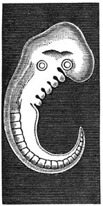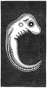 1 Wij zagen vroeger, dat de embryologie leert, dat de mensch en de zoogdieren in den moederschoot alle phasen doorloopen, die bij de ontwikkeling der soorten doorloopen zijn, en dat ieder onzer eenige dagen kruipend dier, viervoetig dier enz. geweest is. Wij zagen tevens, dat de afgestorven organen nog in ons lichaam voorkomen, als getuigen uit het verledene. Langen tijd heeft men er over getwist, of de menschelijke vrucht eenigen tijd eenen staart bezit, met wervels als die der apen en viervoetige dieren. Die vraag is onlangs voor goed opgelost. In de zitting der Académie des Sciences van 8 Juni 1885 heeft de Heer Fol bewezen, dat de menschelijke vrucht van 5½ millimeter, d.i. van 25 dagen, 32 wervels bezit; die van 9 tot 10 millimeters, d.i. van 35 tot 40 dagen, 38 wervels. Het menschelijke geraamte heeft er slechts 24. Die staartaanhangsels blijven slechts kort. Bij vruchten van 12 millimeters, d.i. van zes weken, vergroeien de 38ste, 37ste en 36ste te zamen, terwijl de 35ste niet meer scherp gescheiden is. Eene vrucht van 19 millimeters heeft nog slechts 34 wervels. Hieruit volgt, dat de normale vrucht in de 5de en 6de week harer ontwikkeling eenen staart heeft van kegelvormige gedaante, uit wervels bestaande en van het lichaam gescheiden.