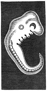 Fig. 327. De fossiele mensch, in 1872 in een hol te Mentone gevonden, thans aanwezig in het museüm te Parijs.