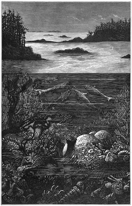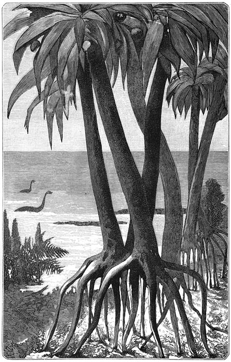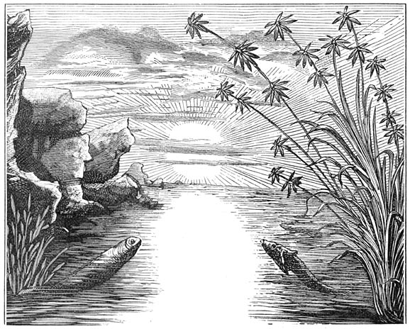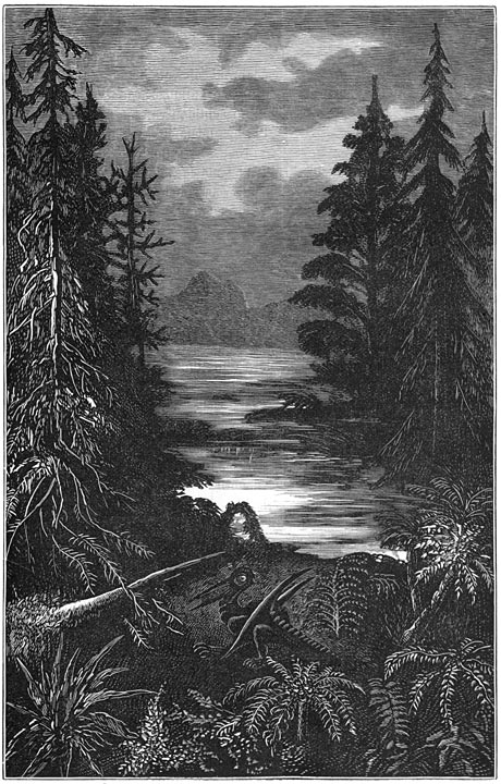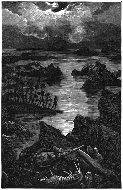 Grootsche landschappen van vervlogen eeuwen! geen menschenblik heeft u aanschouwd, geen oor heeft uwe harmoniën begrepen, uwe tooverachtige panorama’s hebben geene enkele gedachte opgewekt. Des daags verlichtte de zon alleen de gevechten en spelen van het dierlijk leven; des nachts bescheen de maan den slaap der zich onbewuste natuur.