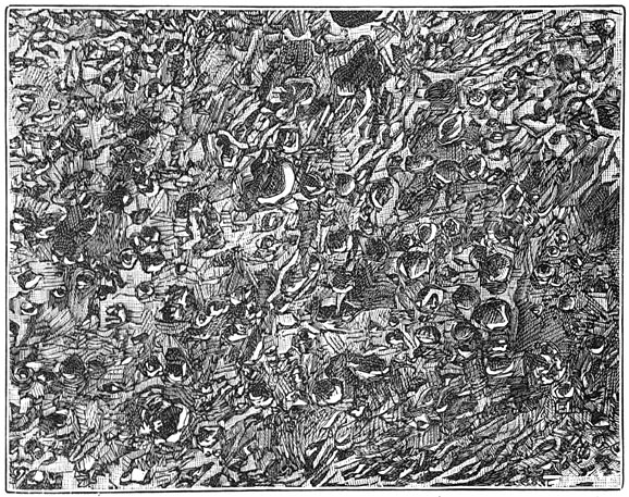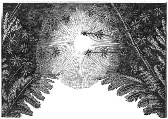 Bij die koude straalde de aarde hare warmte langzamerhand geheel uit; noch de voortgaande verdichting, noch de scheikundige verbindingen, noch de val van kosmische stof, die op haar neerkwam van de zonnenevelvlek en van de verschillende deelen der ruimte, waren voldoende [24]om te herstellen, wat zij door die uitstraling verloor. De aarde werd van gasvormig vloeibaar, wel nog gloeiend, maar nog steeds minder lichtgevend. In stede van wit en schitterend werd zij eerst goudgeel, daarna oranjekleurig, rossig en donkerrood. Een dikke, zware, in beroering zijnde dampkring omgaf haar. Eindelijk doofde zij uit. Als zon had zij uitgediend, maar om zich te koesteren aan den morgenstond van het leven.