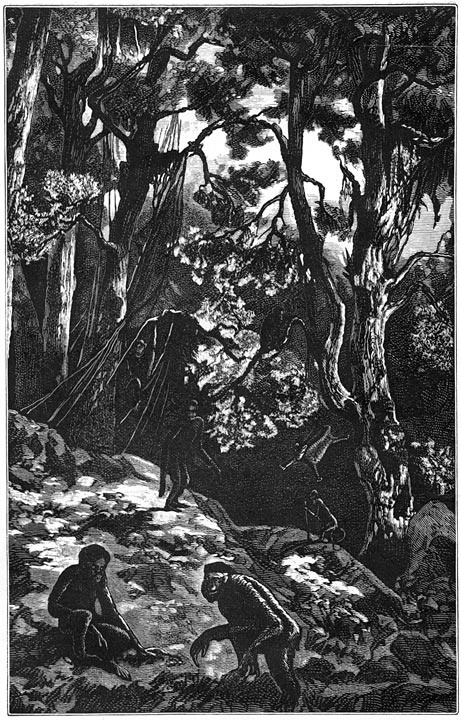Vóórdat zij den ploeg, de spade, den molen, den oven, de kuip, het vat, de kom, den lepel, de vork, het mes hadden uitgevonden, leefden die wezens, die langzamerhand menschen geworden zijn, maar die toen slechts redelooze dieren waren, in bosschen en holen, en moesten zij zelf hun voedsel zoeken, evenals hunne tijdgenooten, de apen, wolven, tijgers, wilde paarden, olifanten, beren, hyena’s, jakhalzen, bevers enz. Komt hun reeds de naam van mensch toe? Naar ons oordeel niet. Dat zij zich met de voeten, de handen en het hoofd verdedigen als zij aangevallen zijn, bewijst niets, immers dat doen ook de apen. Dat zij eene vrucht nemen en die naar het hoofd van hunnen tegenstander werpen, bewijst evenmin iets, dat doet de aap eveneens. Ook de aap grijpt eenen tak, dien hij doorbreekt en waarmede hij bij den aanval om zich heen slaat. Bijna alle dieren zorgen voor hun kroost.