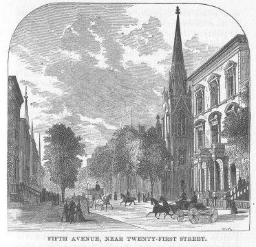The southern portion is densely built up. Between the City Hall and Twenty-third street New York is more thickly populated than any city in America. It is in this section that the “tenement houses,” or buildings containing from five to twenty families, are to be found. The greatest mortality is in these over-crowded districts, which the severest police measures cannot keep clean and free from filth. The southern portion of the city is devoted almost exclusively to trade, comparatively few p. 51persons residing below the City Hall. Below Canal street the streets are narrow, crooked, and irregular. Above Houston street they are broad and straight, and are laid out at regular intervals. Above Houston street, the streets extending across the island are numbered. The avenues begin in the vicinity of Third street, and extend, or will extend to the northern limit of the island, running parallel with the Hudson River. There are twelve fine avenues at parallel distances apart of about 800 feet. Second and Eighth are the longest, and Fifth, Madison and Lexington the most fashionable. They commence with Avenue D, a short street, near the East River. West of this, and parallel with it, are three avenues somewhat longer, called Avenues C, B, and A, the last being the most westerly. Then begin the long avenues, which are numbered First, Second, and so on, as they increase to the westward. There are two other avenues shorter than those with numbers, viz: Lexington, lying between Third and Fourth, and extending from Fourteenth street on the south to Sixty-ninth street on the north; and Madison, between Fourth and Fifth, and extending from Twenty-third street at Madison Square to Eighty-sixth street. Madison and Lexington are each to be prolonged to the Harlem River. These avenues are all 100 feet wide, except Lexington and Madison, which are seventy-five feet wide, and Fourth avenue, above Thirty-fourth street, which is 140 feet wide. Third avenue is the main street on the east side above the Bowery, of which it is a continuation, and Eighth avenue is the principal highway on the west side. Fifth and Madison avenues are the most fashionable, and are magnificently built up with private residences below the Park. The cross streets connecting them are also handsomely built.