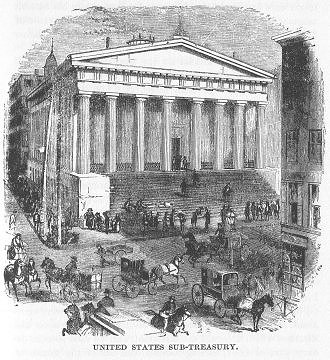 The Custom House building was formerly the Merchants’ Exchange. It is one of the handsomest structures in the city, and its purchase cost the General Government one million of dollars in gold. The building is constructed of solid granite, with a fine portico and colonnade in front. If is fire-proof throughout. It occupies the entire block bounded by Wall street, Exchange Place, William street, and Hanover street. Its dimensions are a depth of two hundred feet, a frontage of one hundred and forty-four feet, and a rear breadth of one hundred and seventy-one feet. The top of the central dome is one hundred and twenty-four feet from the ground. The main entrance is on Wall street, but there are entrances on every side. The Rotunda occupies the space beneath the central dome, and is one of the finest interiors in the country.