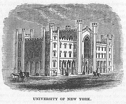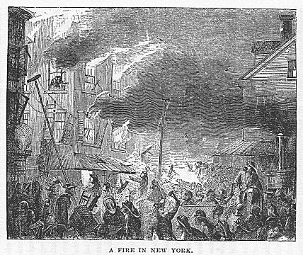 The war of 1812-15 for a while stopped the growth of the city, but after the return of peace its progress was resumed. In August, 1812, experimental gas lamps were placed in the City Hall Park, though the use of gas for purposes of lighting was not begun until 1825. In 1822 the yellow fever again drove the population up the island, and caused a rapid growth of the city above Canal street. In 1825 the Erie Canal was completed. This great work, by placing the trade of the West in the hands of New York, gave a powerful impetus to the growth of the city, which was at that time spreading at the rate of from 1000 to 1500 houses per year. In 1832 and 1834, the cholera raged severely, carrying off upwards of 4484 persons in the two years. In 1835, the “great fire” occurred. This terrible conflagration broke out on the 16th of December of that year, and swept the First Ward of the city east of Broadway and below Wall street. It laid almost the entire business quarter in ashes, destroyed 648 houses, and inflicted upon the city a loss of over $18,000,000. New York rose from this disaster with wonderful energy and rapidity, but only to meet, in 1837, the most terrible financial crisis that had ever burst upon the country. Even this did not check the growth of the city, the population increasing 110,100 between 1830 and 1840. In 1842 the Croton water was introduced. In 1849 and 1854 the p. 49cholera again appeared, killing over 5400 persons. In 1852, the first street railway was built. In 1858, the Central Park was begun.