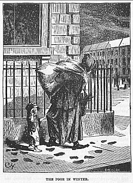 Perhaps the most annoying of the street beggars are the children. They frequent all parts of the city, but literally infest Fourteenth street and the lower part of the Fifth avenue. Many of them are driven into the streets by their parents to beg. They have the most pitiful tales to tell if you will listen p. 804to them. There is one little girl who frequents Fourteenth street, whose “mother has just died and left seven small children,” every day in the last two years. A gentleman was once accosted by two of these children, whose feet were bare, although the weather was very cold. Seizing each by the arm, he ordered them to put on their shoes and stockings. His manner was so positive that they at once sat down on a door step, and producing their shoes and stockings from beneath their shawls, put them on. Many of these children support drunken or depraved parents by begging, and are soundly beaten by them if they return home at night without money. They grow up to a life of vagrancy. They soon learn to cheat and steal, and from such offences they pass rapidly into prostitution and crime.