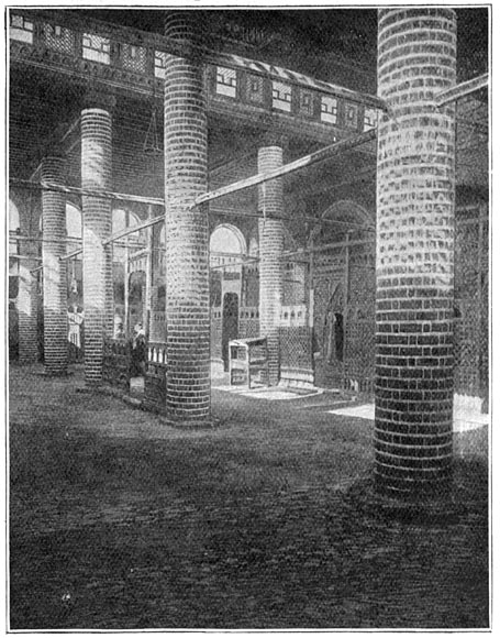 Die groote binnenplaats heeft ongeveer den vorm van een rechthoek; aan weerszijden zijn winkels, woningen voor de bedienden, de werkplaatsen der ambachtslieden, de gebouwen, welke dienen voor de uitgebreide werkzaamheden, verbonden met het landbouwbedrijf, [324]keukens, bergplaatsen van allerlei aard en stallen voor de lastdieren. Hier stijgen bezoekers af van hun ezels, kameelen of paarden; zij worden omringd door beleefde bedienden, die hun vragen richten tot hen die den vreemdeling vergezellen en hem met den gebruikelijken heilwensch bij zijn aankomst begroeten, terwijl anderen hun meesters gaan waarschuwen, indien deze niet op de binnenplaats aanwezig zijn.