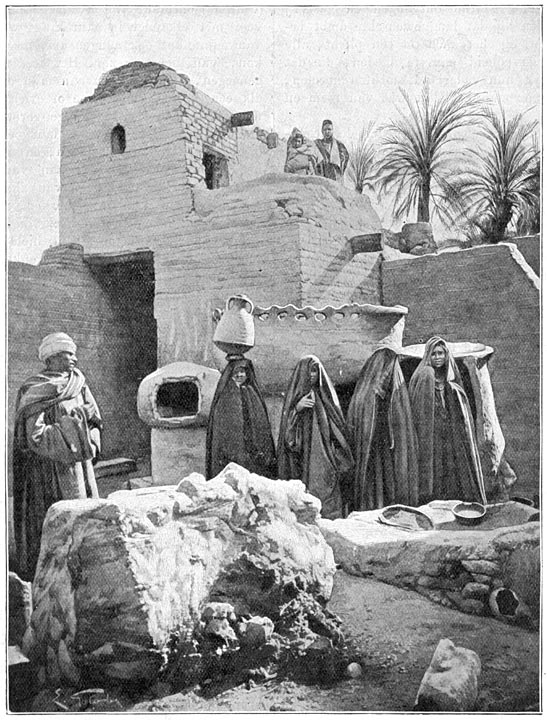 Op den drempel van hare hutten, op het terras, of in de nauwe straatjes waren de vrouwen druk aan het babbelen, in hare lange mellâyehs van bruine wol of blauw katoen gehuld, terwijl ze voor het huishouden zorgden, of midden in het vuil het gereedschap schoonmaakten, dat ze aanstonds zouden gebruiken. Aan haar ronde armen rinkelden de armbanden van koper, glas, zilver en goud, waarmee ze zich versieren, en zoodra ik er aankwam bedekten ze zich het gezicht, op een klein kiertje na, waardoor haar zwarte oogen, zonder gezien te worden, den vreemden heer bespiedden, die hun dorp doortrok.