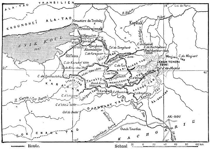 Na Prjevalsk volgen wij den weg, die door den Santachpas langs de bergketens van Ala-Taou en Koungheï-Ala-Taou voert, en te Viernyi uitkomt. De weg loopt door een vruchtbare, maar weinig bebouwde streek, aan den voet van het Ala-Taou gebergte.