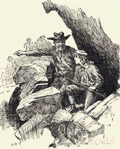 "Now, is your rifle all ready?" whispered Pike. "Don't rouse those poor little people in there until we have to. They must stay way back in the cave. Now, observe strictly what I tell you: I want you to aim at the taller of those two Indians who are the leaders. Do not fire until I give the word; but be sure you hit. Recollect now, you've got to fire down hill, and the bullets fly high. Aim below his waistband, then you'll probably strike him either through the heart or the upper chest. Now, go to your loophole and stay there. Are you ready, Jim?"