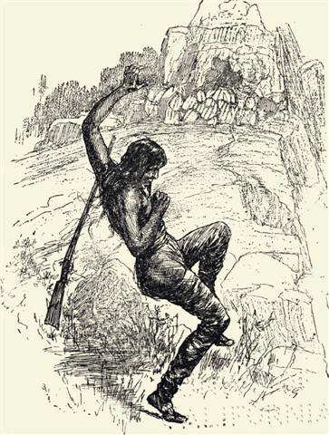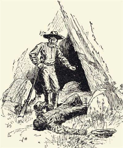 Bang! bang! rang out almost simultaneously the reports of two rifles. The smoke floated upward. Pike and Jim had the good sense not to attempt to lift their heads or peer over the barriers, but to content themselves with looking through the loopholes. One look revealed the scene. "The little, skinny cuss," as Pike had called him, clasping his hands to his breast, had fallen head foremost among the rocks up which he was climbing. But the tall Indian, giving a spring like that of a cat, had leaped behind a bowlder full ten feet away from him, and the next instant,—bang! went his rifle, and a bullet whizzed overhead and struck, flattening itself upon the rocks.
