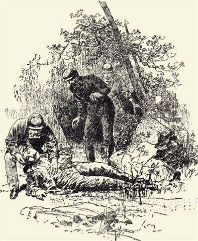 Some of them, believing Indians to be upon them, sprang for their arms; others bent to the aid of the stricken man. They turned him over on his back, brought water and bathed the blood from his face, and then a sergeant cried: