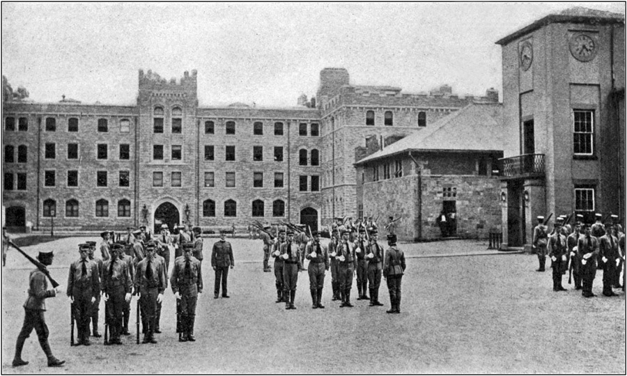 They had reached the front of Grant Hall by this time and were strolling slowly along, their voices hushed for the moment by the cheery hum of boyish talk and the clatter of mess furniture, as the Corps sat at their late supper. Then several officers, gathered about the steps of the club rooms in the south end, lifted their caps to Mrs. Graham and smiled greeting to the party.