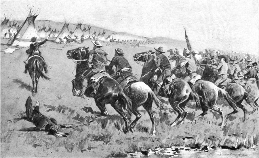 For there came a day when men's faces [246]went white with the news that Sitting Bull, the great chief (Tatanka-iyo-Tanka), had died in desperate fight with the police sent to arrest him; that Si Tanka and his band, nabbed by "Napa Yahmni," had most unaccountably managed later to elude him, and were now at large, raising the standard of revolt, summoning all the wild warriors far and near to join forces with him. And then, indeed, the frontier blazed with signal-fires by night and burning ranches by day, and there came a week of hard riding for the old regiment, and of sharp campaigning for all—a week in which at last the wily red chief Si Tanka was finally surrounded and, with all his people and ponies, herded on down through the Bad Lands to the breaks of Wounded Knee—fierce, truculent, defiant. For long months he had braved the "Great Father" himself, refusing to submit to any authority; but the sight of those long columns of silent, disciplined "horse soldiers," squadrons white and black, some of them riding along with wonderful little field-guns clinking beside them on wheels, [247]overawed Si Tanka's followers and disheartened his friends.