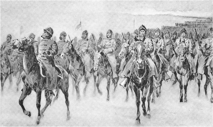 First, however, there was wonderful welcome for him at Niobrara. The skies had grown wintry. The snow patches were beginning to dot the prairie, but the camp-fires burned the brighter, and men clustered about them and talked of the "luck" of the new lieutenant, whom the general himself alighted from his escort wagon to greet and [243]to question. For several days the chums were needed at the fort, where both prisoners and witnesses were held, but the case against the self-styled hunters was so overwhelming that the demand for their stay was soon at an end, and, in the train of the general, they went on westward to the winter camp of the assembled cavalry, whither "the old regiment" had preceded them, and there, one dark and wintry evening, with the snow-flakes sifting down, and the depths of a distant valley all dotted with tiny blazes—the cook fires of a whole brigade—they were met by a troop of cavalry in fur caps and gauntlets, and huge, blanket-lined overcoats—swarthy, bearded fellows, with service-stained boots and trappings, but looking fit for the hardest kind of campaigning and any kind of a fight. It swung from column into line, saluted the general with advanced carbines, and then, wheeling by fours to right, trotted briskly away with the little cortège, and presently its commander, after a few words with the general, fell back, peering from under his bushy headpiece, and sung [244]out in cheery tones Geordie had not heard for many a day, yet knew on the instant: