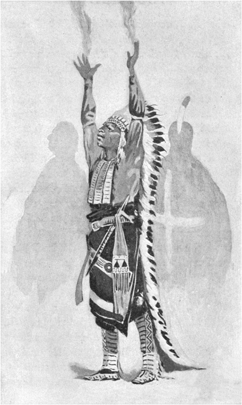 And just as he spoke, and before either could turn to the waiting horses, up into air went the hands of the chanter, up went two little puffs of earth, sand, and gravel as he tossed them on high; and before even they could come sifting and showering downward, up in a flash sprang the muttering line, off went every blanket, and out leaped a warrior, armed and painted for battle. Suddenly they whirled on the searchers advancing upon them. Crash went their wild volley, downing both friend and foe, for the first shots tore straight through the huddle of women, and their shrieks followed swift on the deadly clamor of the guns.